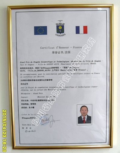 2013年,“中法有机羊肚菌创新合作”,正式列为中法国际政府间合作项目,朱所长带领一批中国专家到法国进行了半年的技术指导,初步生产出了欧洲历史上从未见过的人工羊肚菌,获得了法国的高度评价,并颁发了荣誉证书。获得法国政府颁发的科技进步特等奖,被央视评为“大地之子”光荣称号!